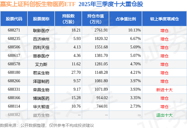 从基金规模来看,嘉实上证科创板生物医药ETF基金2025年三季度公布的基金规模为2.73亿元,较上一期规模2.05亿元变化了6806.87万元,环比变化了33.26%。该基金最新一期资产配置为:股票占净值比99.68%,无债券类资产,现金占净值比0.64%。从基金持仓来看,该基金当季前十大股票仓位达50.45%,第一大重仓股为联影医疗(688271),持仓占比为10.13%。