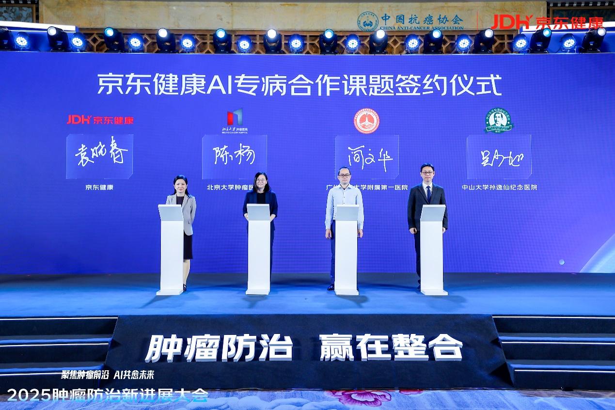 会上,京东健康与中国抗癌协会共同发起“肿瘤整合防治工程(2025-2030)”,构建“防-筛-诊-治-康”全流程体系,将AI等前沿技术深度融合于临床实践,探索肿瘤防治的中国路径。本次大会上,京东健康还分别与广州医科大学附属第一医院、中山大学孙逸仙纪念医院、北京大学肿瘤医院进行AI专病课题合作签约,持续引领肿瘤诊疗模式系统性革新,为专科专病医学实践与患者管理注入科技动力。